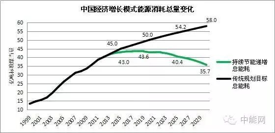 我们即便按照新常态状况下的2015年的万元人民币GDP产值减少34.48公斤标煤核算,考虑到越接近边际节能潜力越小的边际效应特点,在2020年之后在34.48公斤标煤/万元GDP的基础上降速减缓3/4到25.86公斤标煤/万元GDP,2025年再减缓3/4至19.39公斤标煤/万元GDP。中国的总能源消耗将在2018年达到天花板,最高达到43.6亿吨标煤,误差时间在两年之内,误差率在2亿吨标煤(误差主要来自过去统计数据层面的问题)。也就是说,中国的总能耗的天花板将不会超过46亿吨。