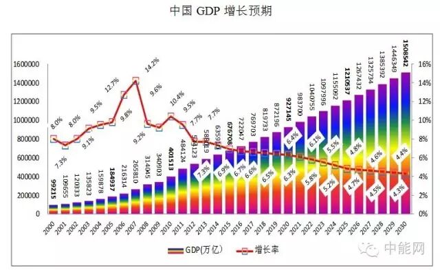 2030年能源消费58亿吨标煤,人均4吨。这是基于2016年两会期间,国家卫计委主任李斌的一项关于中国人口的预测。她说:“2015年,全国总人口是13.75亿人,未来峰值人口约为14.5亿人。到2050年,全国总人口预计仍有13.8亿人”。一般估计,14.5亿的峰值将会出现在2030年前后,此后人口将逐渐下降。以14.5亿人口,人均4吨标煤计算,正好是58亿吨标煤。