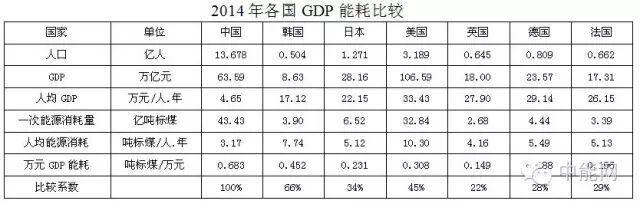 2014年,美国的单位GDP能耗是中国的45%,日本是中国的34%,德国是中国的28%,英国是中国的22%。也就是说中国能源消费不增加,GDP增加1 倍接近美国2014年水平,GDP增加2倍接近德法,GDP增加3倍接近英国,GDP增加4倍接近丹麦。