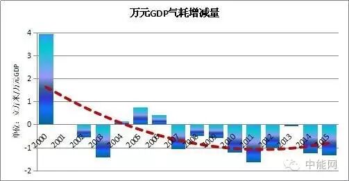在各种能源的单位GDP产值能耗变化指标中,只有天然气是一个短板。1999年每万元人民币GDP产值的天然气消耗是25立方米,尽管由于油气企业杀鸡取卵,将天然气价格大幅度推升导致市场需求的严重萎缩,2015年中国万元人民币GDP产值气耗降至19立方米的多年最低点,其他年份但大致都在21~29立方米之间波动。16年来的平均每万元GDP产值天然气的增减量为0立方米气耗量,也就是平均值没有变化。随着能源结构的转型,可再生能源的比重增加,第三产业和居民用能比重的升上,第二产业,特别是重工业比重的的下降,对于天然气的需求将会继续呈现上涨趋势。