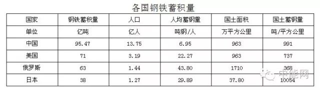 持中国能源需求还会继续增长观点的人,不断强调的一个问题就是中国还没有完成美国和欧洲的人均钢铁、水泥的蓄积量。美国粗钢蓄积总量71亿吨,日本38亿吨,前苏联56亿吨。我们暂且不说中国人需不需要这么钢。