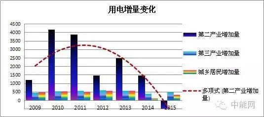 第二产业的增速也在下降,而这一趋势不是从“新常态”后才开始的,下图可以显而易见,2010年第二产业增速达到最高点之后,就开始一路下滑,直到2015年出现了负增长。第二产业增速的下降是因为四万亿之后增速太快导致的,因为没有市场需求,曾都下降也是自然而然的事情。尽管第三产业和居民用电保持着合理的增速,但是完全不能弥补第二产业减速带来的市场空缺,全社会用电量的下降也是必然的趋势。
