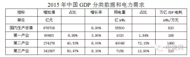形成这一趋势的原因是中国产业结构的转型和节能减排效益的彰显。2015年中国第三产业创造了34.2万亿的GDP,占GDP增长率的50.47%,消耗电力7158亿kWh,仅占用电总量的12.9%。第三产业每创造1万元GDP产值只要210kWh的电量,而第二产业却需要消耗1460kWh,几乎是第三产业的7倍。而第二产业的增速明显低于第三产业,这种结构性转型对于未来中国电力需要的趋势将产生巨大的影响,而电力需求也不可能维持此前的增长模式。